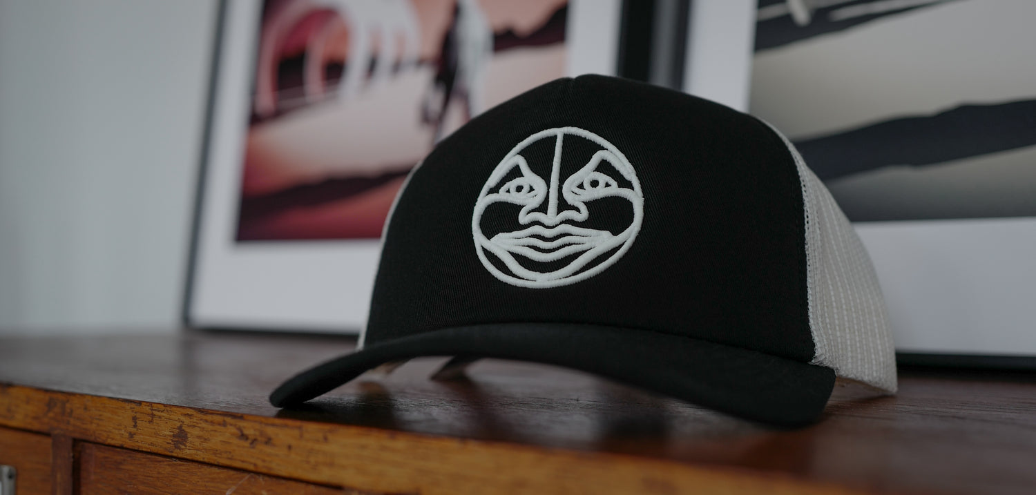 Black/white Trucker Cap with white moonface logo